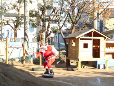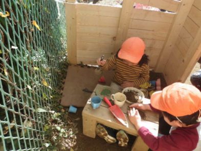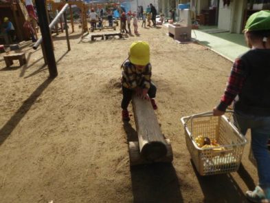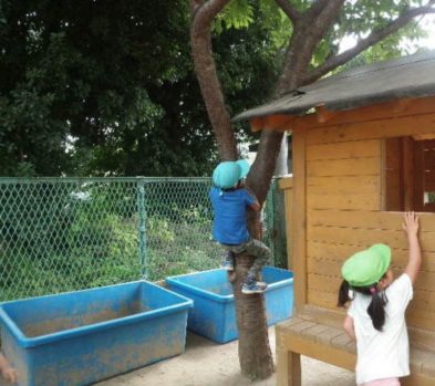 豊島区内で一番広い園庭には、大きな築山があります。木製遊具(一本橋、ブランコ、ログハウス等)は、環境アドバイザーの講師の指導の下、職員が作りました。子どもが主体的に遊びを楽しめる環境を目指しています。 - 地域子育て支援事業